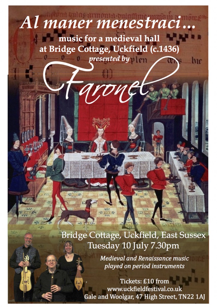 Bridge Cottage in Uckfield is a wealden hall house built in around 1436; it has recently been restored as a venue for community events and a popular concert series. Our concert took place in the hall chamber and featured the type of repertoire from the 14th to 16th centuries that itinerant musicians would have performed in domestic spaces such as this.